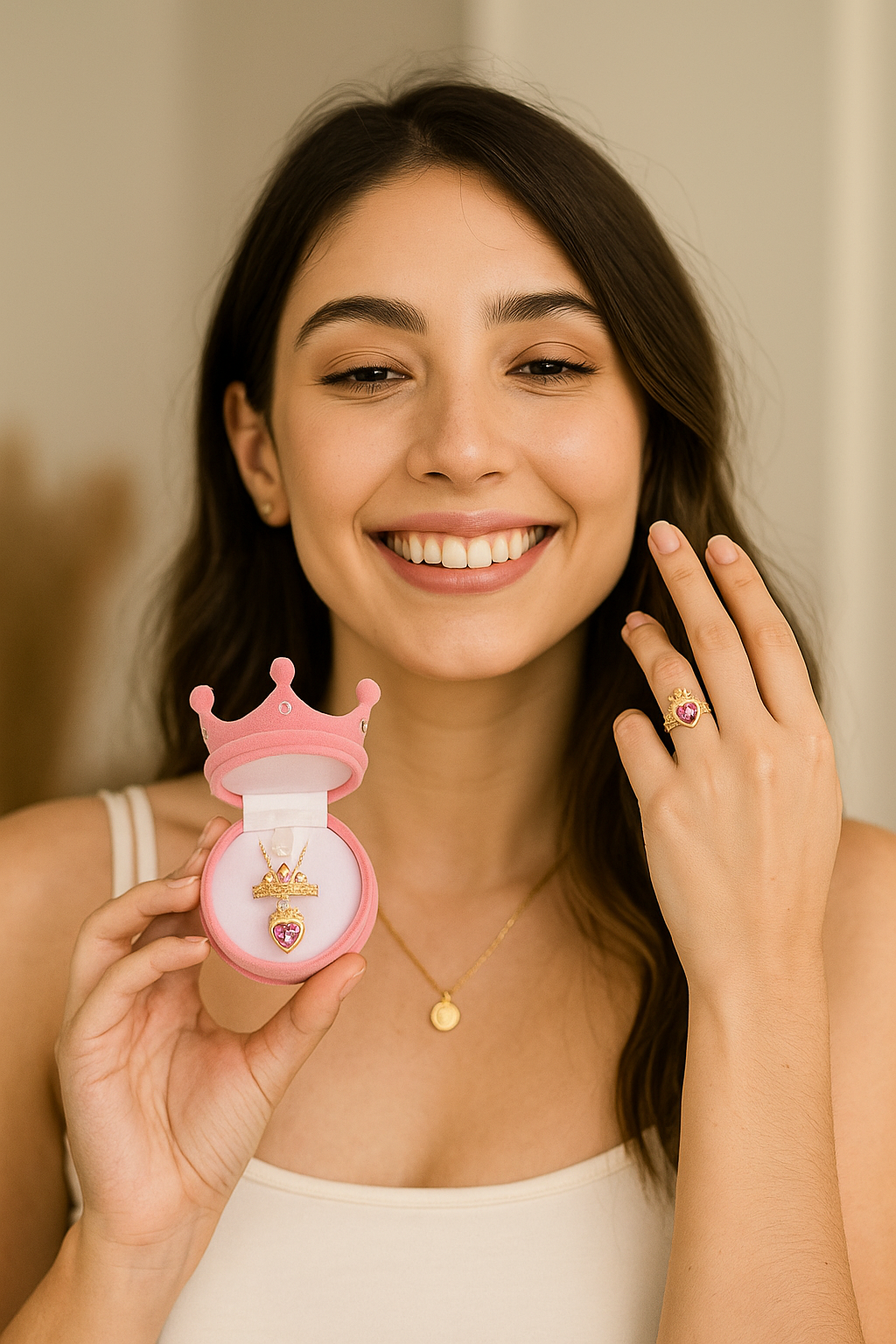 ✨ Llévate el set completo (collar + anillo + estuche corona) a precio promocional por tiempo limitado.
